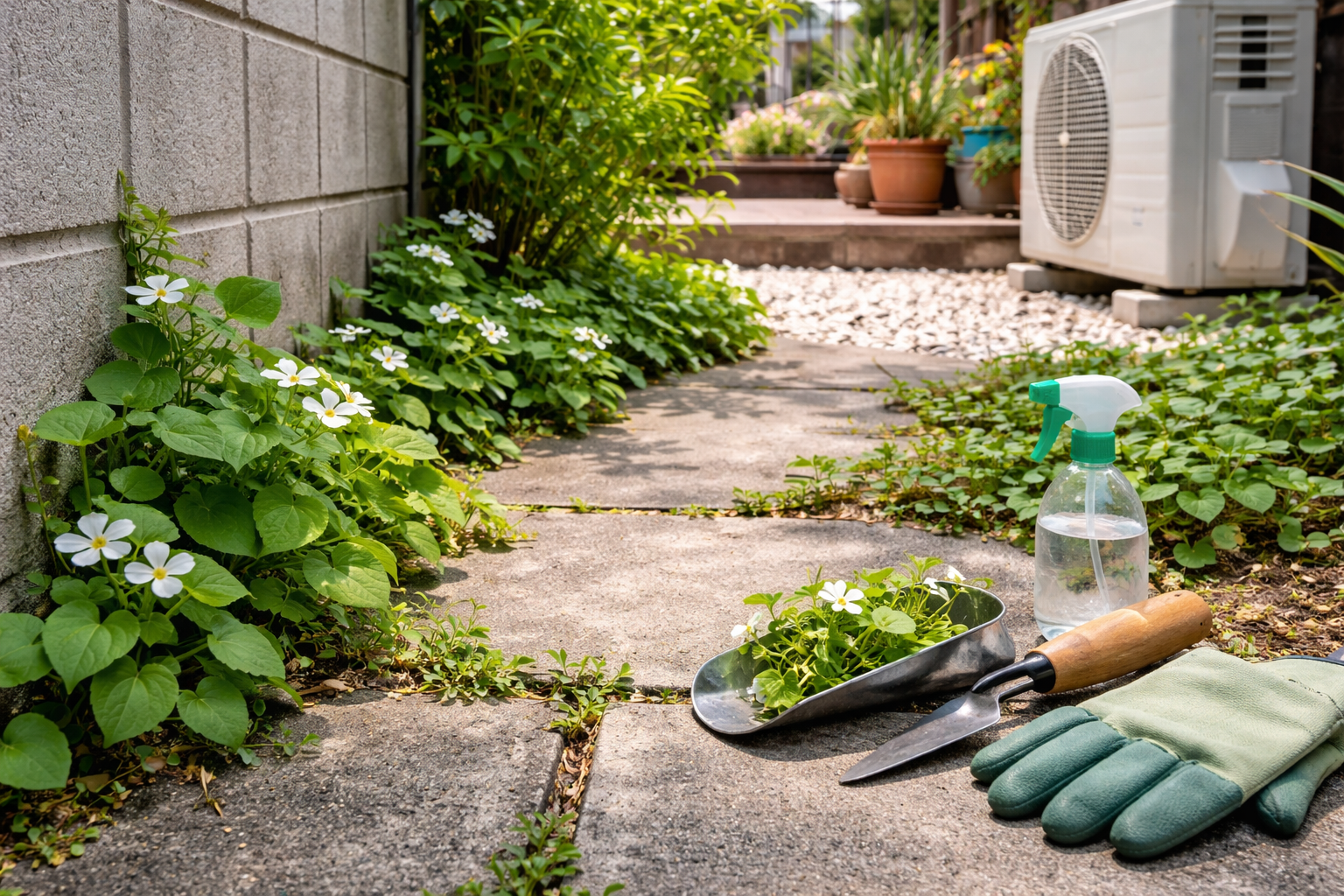日陰や湿気のある場所でも育ちやすく、室外機周りや玄関前にも広がりやすいです。