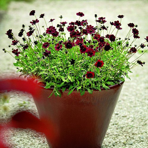 チョコレートコスモスは、その名の通りチョコレートのような甘い香りが特徴の花です。コスモス属に属し、メキシコが原産です。花色は深いバーガンディー色で、茎が細長く、花びらは丸みを帯びています。これは夏から秋にかけて咲くため、その時期の庭でよく見られます。この花はそのユニークな色と香りで人気があり、庭園や花壇のアクセントとして用いられることが多いです。また、切花としても人気がありますね。