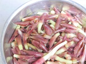 若い茎は、シャキッとした歯ごたえがあり、ほんのりミョウガの風味が漂います。花穂ほどの強い香りはありませんが、その分料理との相性もよく、炒め物や浅漬けにすると程よいアクセントになります。
