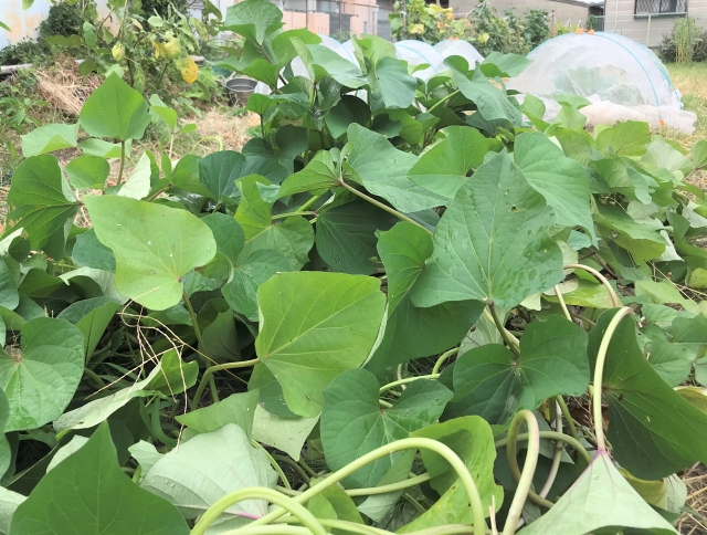 さつまいもの葉は、植え付け後1〜2か月ほど経った頃からどんどん繁殖します。この時期の若く柔らかい葉っぱと茎(ツルの先端)が食用に適しています。