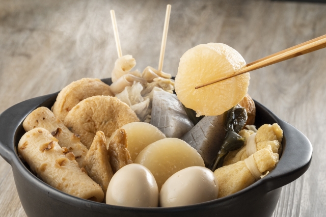 おでんの出汁は昆布やかつお節の基本だしに、練り物や野菜から出たコクが合わさり、まさに万能スープのような存在です。