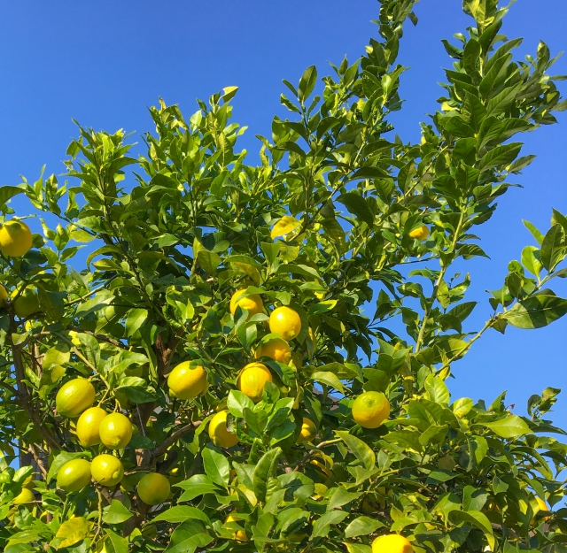 レモンの木について、美しい緑の葉と鮮やかな黄色の果実が特徴です。