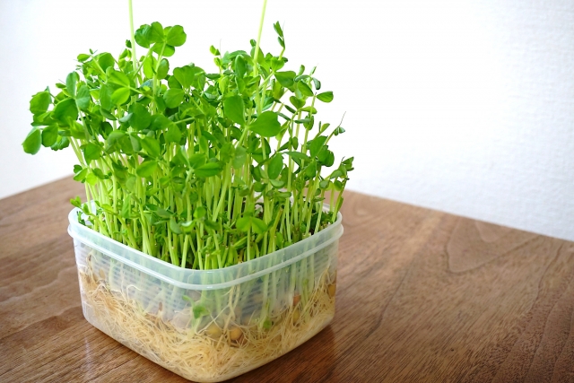 豆苗はエンドウ豆の若葉を食用にしたもので、根と豆がついた状態で販売されています。食べた後、根を水に浸けて育てると新しい芽が伸びてきます。これが「再生栽培」です。