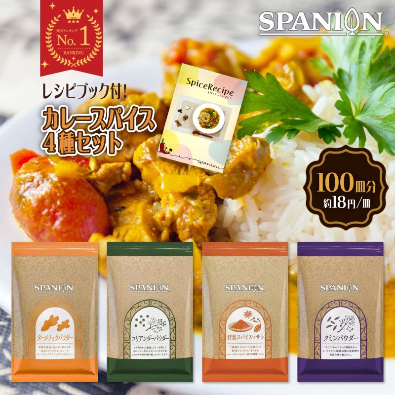 【楽天市場】【デイリー1位】食いしんぼう祭対象★カレースパイス4種セット 各100g レシピブック付 約100皿分 チャック袋入り カレー スパイス スパイスカレー カレーパウダー カレー粉 カレースパイスパウダー スパイスセット 送料無料 ターメリック クミン コリアンダー スパイスマサラ:スパイス専門店 SPANION