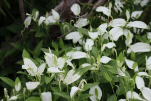 ドクダミは葉が白くなりません。ハンゲショウは葉の一部が白く変化する点が特徴です。